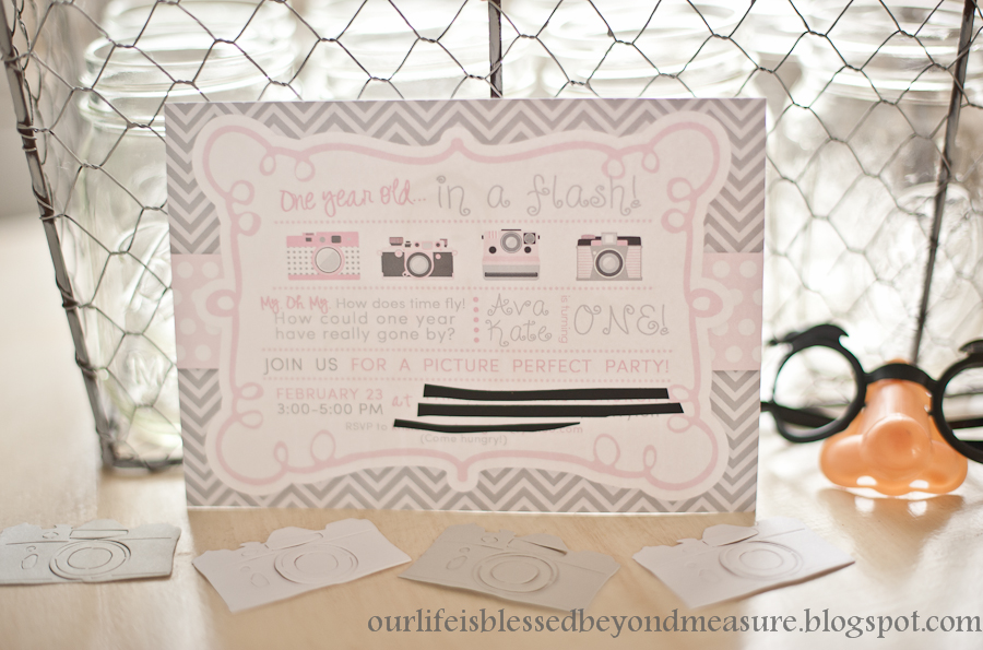 For months, I was scouring the internet (mainly Pinterest) looking for the perfect 'theme' for my girl's first birthday party. I knew I wanted it to be girly but I also wanted something 'different,' I just didn't know what exactly... One day, I happened upon this party and immediately loved the idea! But I knew I wanted to 'girly' it up and do things differently but I liked the theme itself. I thought it fit perfectly since I love to take pictures and I really do feel like this past year has gone by in a flash. So, anyway, I emailed my blogger friend Ashley about designing her invitation and we got started brainstorming about colors, designs, etc... I am in love with how the invitation turned out and it was exactly what I wanted!! She did a wonderful job!